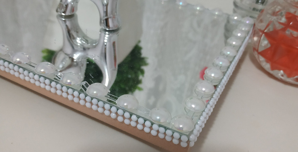 Bandeja retangular espelhada plana, com detalhes em pérolas e strass branco.