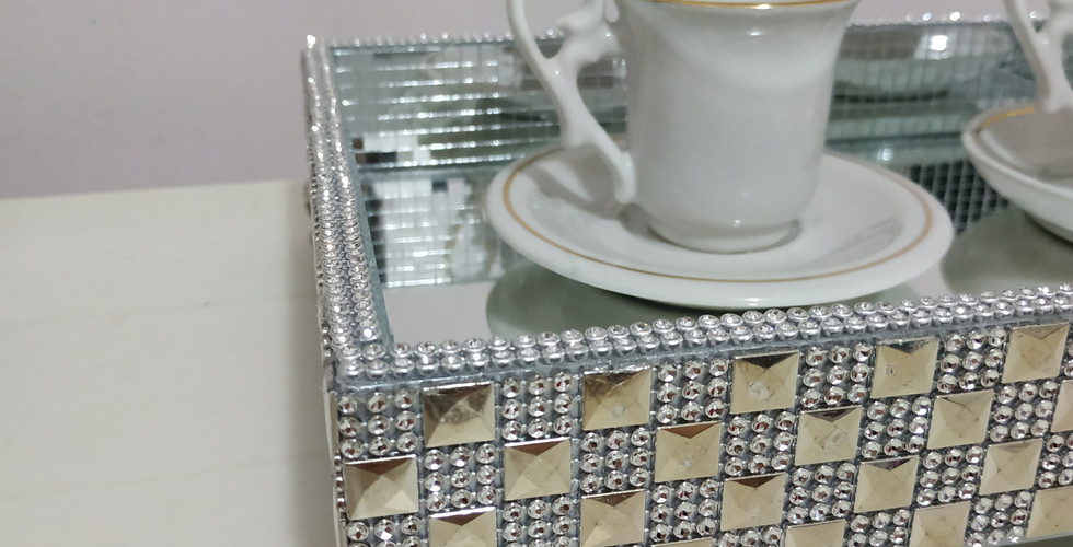 1 bandeja de fundo e borda espelhada retangular, com revestimento em strass prateado., com pezinhos metálicos (C= 30cm, L= 20cm, A= 4cm)