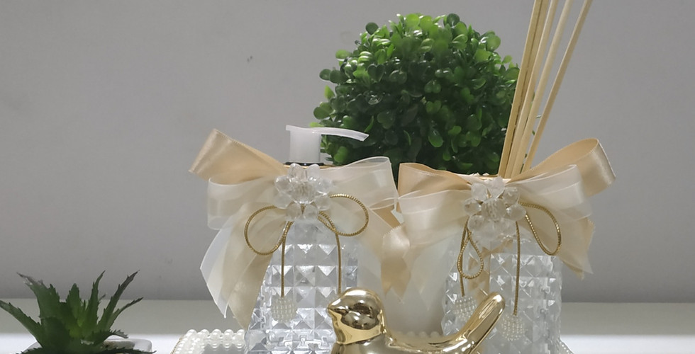 Kit Lavabo: difusor e saboneteira com detalhes em strass pérolas + bandeja espelhada com detalhes em strass dourado e pérolas + uma miniatura (opcional).