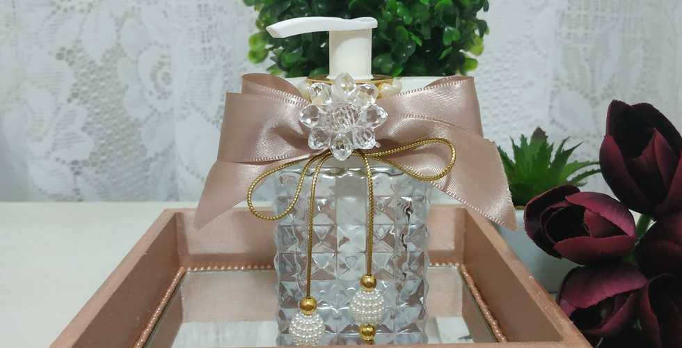 Kit Saboneteira: saboneteira de vidro craquelado com válvula decorada + bandeja rosé de fundo espelhado com detalhes em strass prateado e rosé .